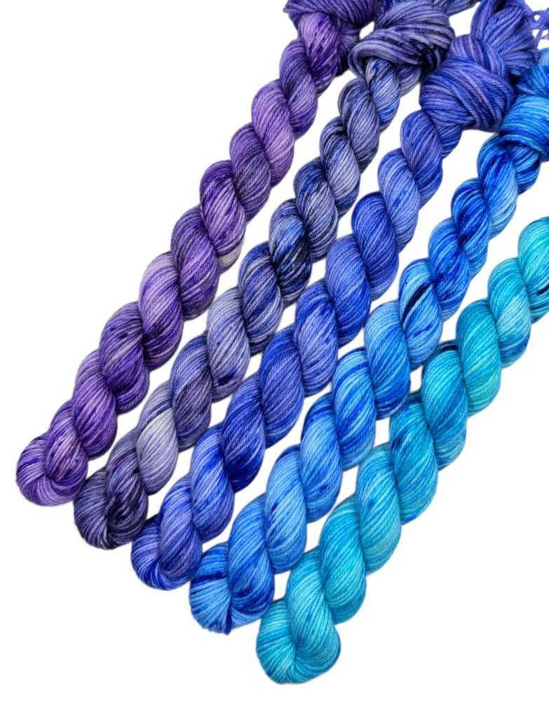 Colorways from l-r: Royal Raisin, Plum Parfait, Blueberry Bake, Mermaid Soda, and Topaz Taffy